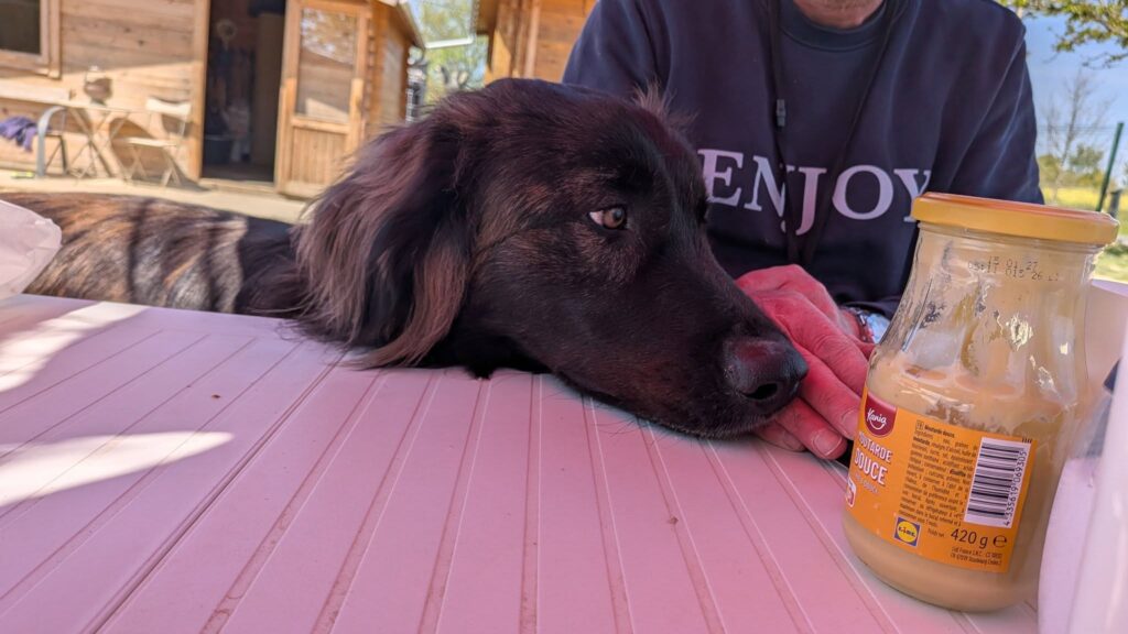 L’adoptant de Guapo étant parti à l’étranger, il a été confié aux parents ne désirant pas garder ce grand chien. Il était donc dans le jardin.